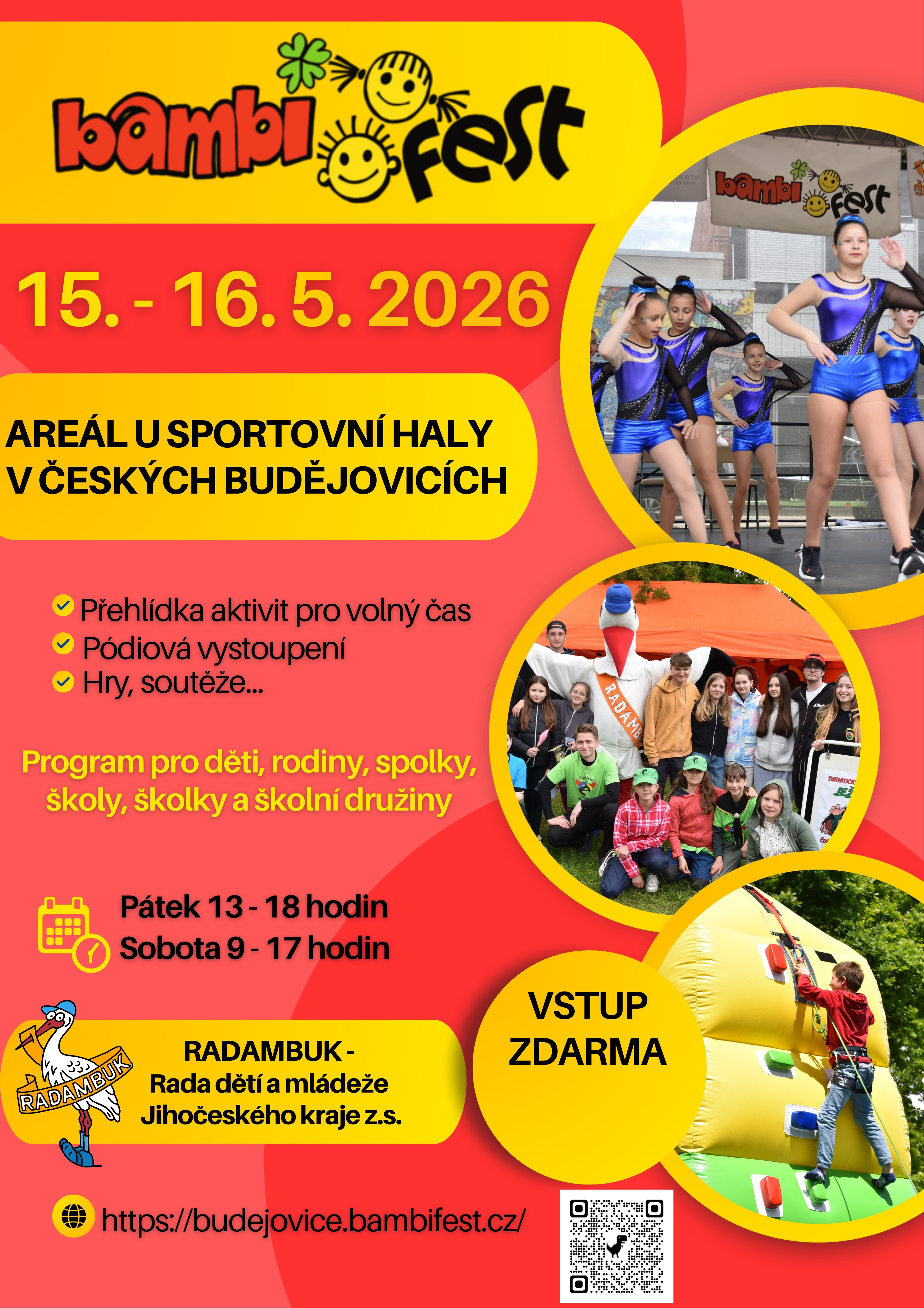 Rádi bychom pozvali co nejvíce souborů tanečních, hudebních, recitačních, dramatických, sportovních aj., které svým vystoupením obohatí, zpestří a oživí program celé akce. Jako v předchozích letech bude opět zajištěno zastřešené stabilní podium (délka 8 m, hloubka 6 m, výška 80 cm) a profesionální zvukařské vybavení). Nejde o perfektní umělecký výkon, ale o to představit se široké veřejnosti. Pro mnohé účinkující se většinou jedná o první vystoupení na pódiu před diváky. Dovolujeme si Vás požádat o vyplnění přihlášky s konkrétním popisem vystoupení a zaslání nejpozději do 25.4.2026 na e-mail kancelar@radambuk.cz.